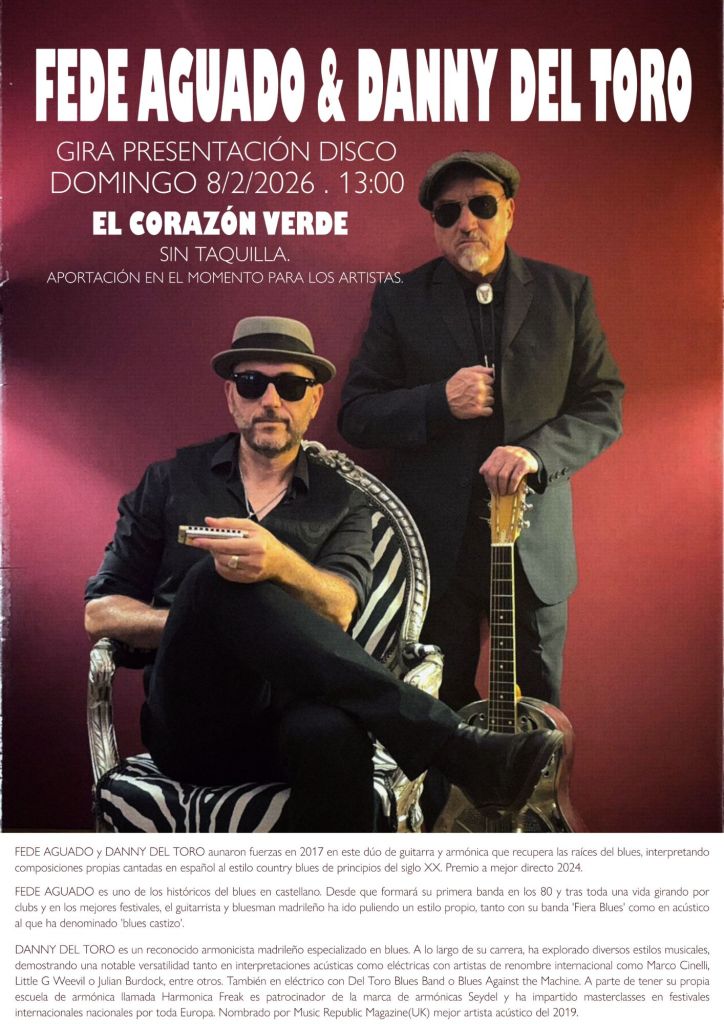 FEDE AGUADO y DANNY DEL TORO aunaron fuerzas en 2017 en este dúo de guitarra y armónica que recupera las raíces del blues, interpretando composiciones propias cantadas en español al estilo country blues de principios del siglo XX. Premio a mejor directo 2024.