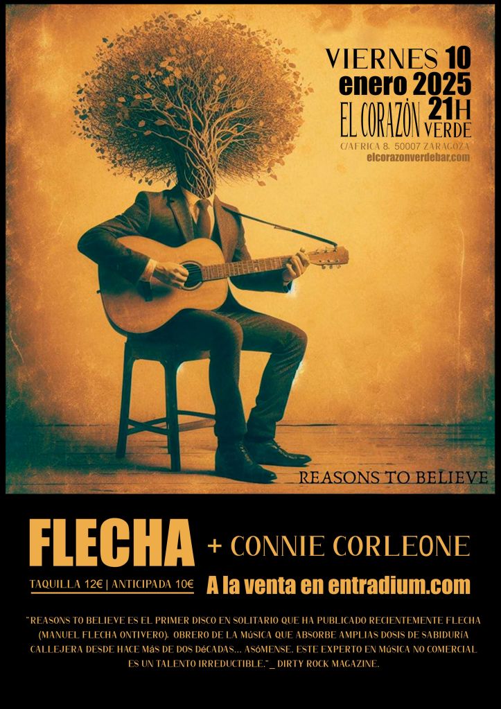 Manuel Flecha Ontivero (FLECHA) es un músico polifacético que, a lo largo de su carrera, ha abarcado diferentes estilos que transitan por el folk, la psicodelia, el garage y el rock progresivo. Casi siempre en un ámbito underground . Este músico afincado en Alcalá de Henares (Madrid) cuenta con diversos trabajos en diferentes formaciones actualmente en activo. Bandas como Musselman (que se hizo eco en medios como Radio3 y RNE -islas de robinson, hoy empieza todo, disco grande-) o Gizzard (formación de rock psicodélico garagero, con la que ha abierto para bandas internacionales como The cynics o Fleshtones Unnatural). Reasons to Believe es el primer disco en solitario que ha publicado recientemente.