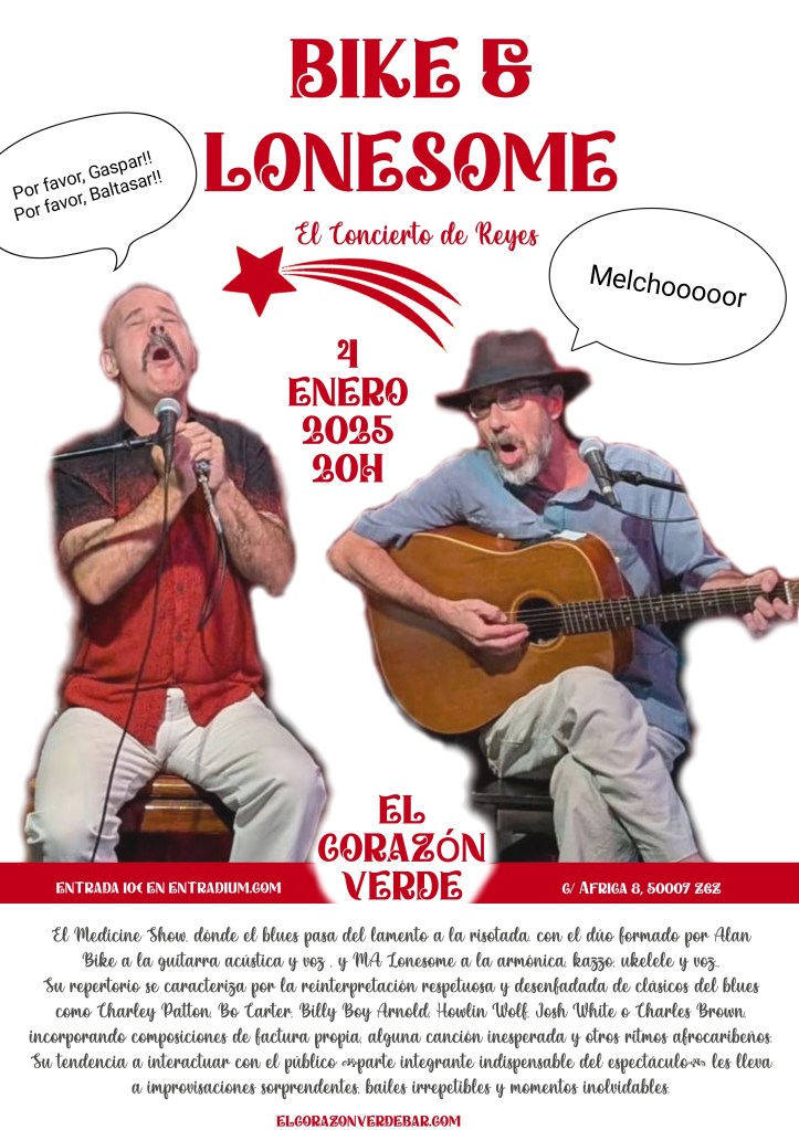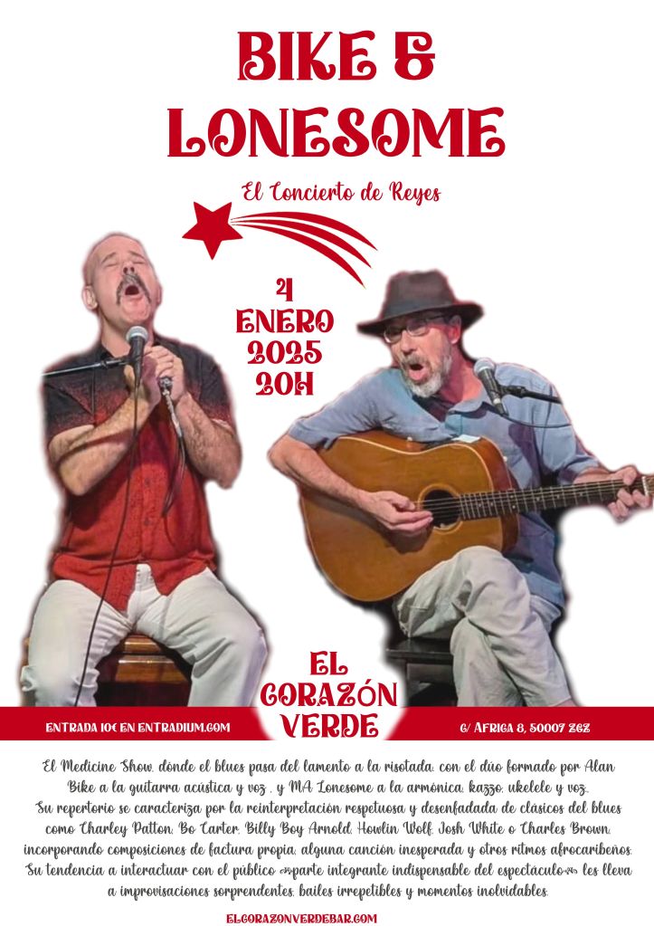 El dúo formado por ALAN BIKE a la guitarra acústica y voz y MA LONESOME a la armónica, kazoo, ukelele y voz, se caracteriza por su reinterpretación respetuosa y desenfadada de clásicos del blues como Charley Patton, Bo Carter, Billy Boy Arnold, Howlin Wolf, Josh White o Charles Brown, incorporando composiciones de factura propia, alguna canción inesperada y otros ritmos afrocaribeños.
