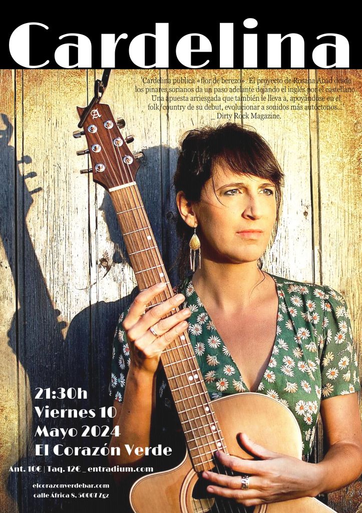 CARDELINA es el proyecto de Rosana Abad, cantante y compositora ubicada en la tierra de Pinares de Burgos y Soria. El estilo folk-country es su sello de identidad, junto con la música de raíz castellana. Ambas corrientes se fusionan en sus composiciones, especialmente en las nuevas canciones, que conforman su nuevo álbum: Flor de Berezo, que ha contado con la participación de artistas como DIEGO GALAZ, BLANCA ALTABLE o CHUCHI CUADRADO, entre otros.