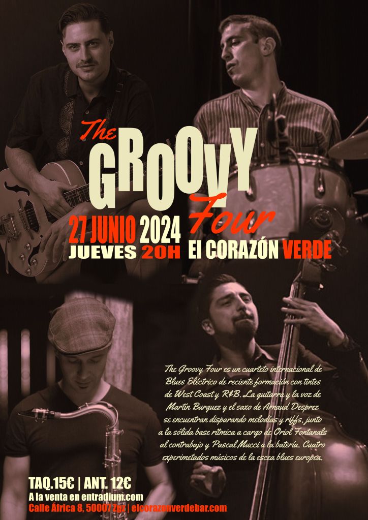 The Groovy Four es un cuarteto internacional de Blues Eléctrico de reciente formación con tintes de West Coast y R&B. La guitarra y la voz de Martín Burguez y el saxo de Arnaud Desprez se encuentran disparando melodías y riffs, junto a la sólida base rítmica a carga de Oriol Fontanals al contrabajo y Pascal Mucci a la batería.