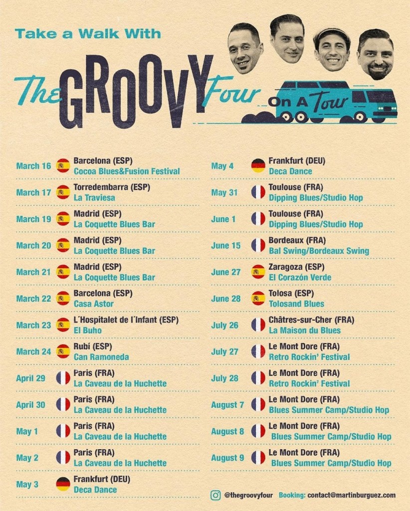 PRESENTACIÓN DEL DISCO ‘TAKE A WALK WITH THE GROOVY FOUR». UNA PARADA INELUDIBLE PARA UN CONCIERTO VESPERTINO A LAS 20H DE LA TARDE. EL JUEVES 27 DE JUNIO.
